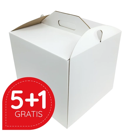 Nasze białe pudełko na tort wysoki 28x28x32 cm z rączką charakteryzują się: