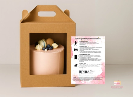 - Okienko: przezroczysta folia PET – trwała, nie paruje, umożliwia stałą kontrolę tortu w transporcie.