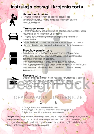 - Zawartość: Instrukcje dotyczące przenoszenia, transportu, przechowywania i krojenia tortu